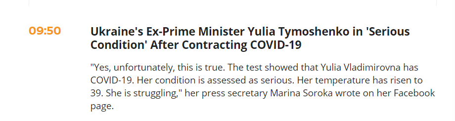 报道称,季莫申科的新闻秘书玛丽娜·索罗卡(Marina Soroka)在脸书上确认这一消息,称“是的,很不幸,这是真的。检测结果表明,季莫申科感染了新冠病毒。她的病情被评估为严重。她的体温上升到39度。她在挣扎。”