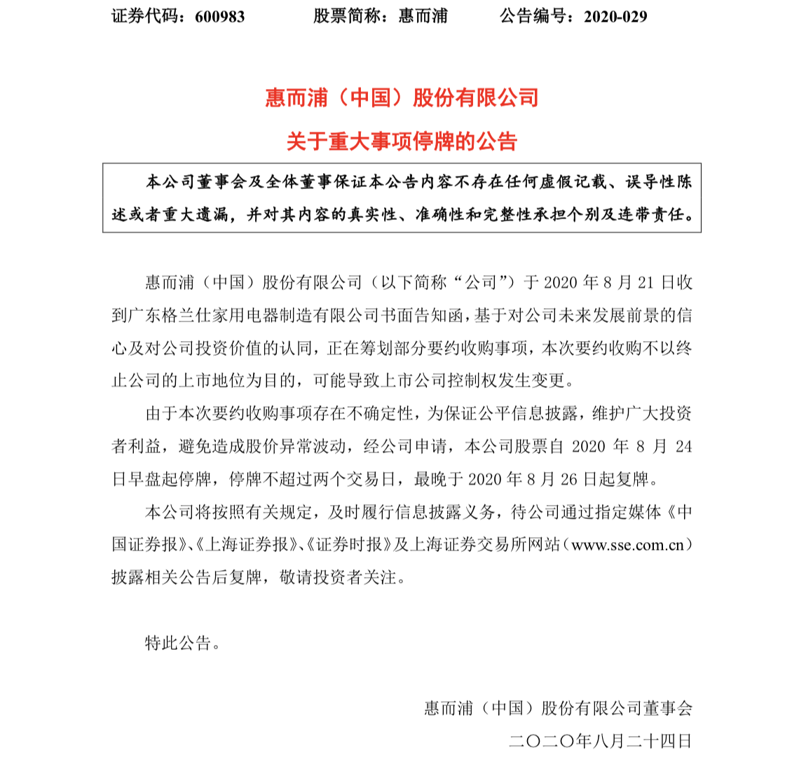 8月23日,惠而浦(中国)股份有限公司(600983.SH)发布公告称,公司在8月21日收到广东格兰仕家用电器制造有限公司书面告知函,正在筹划部分要约收购事项,本次要约收购不以终止公司的上市地位为目的,可能导致上市公司控制权发生变更。