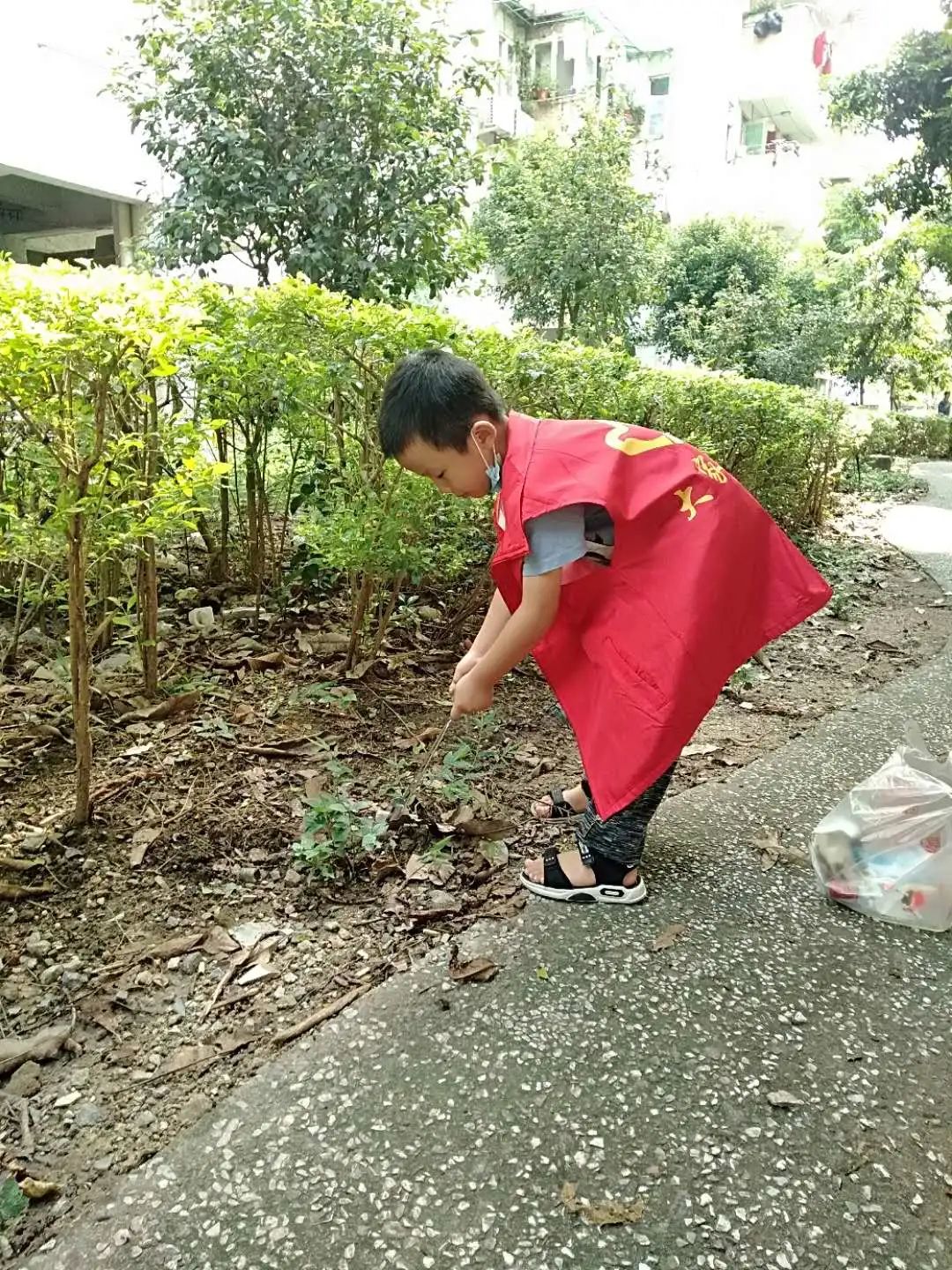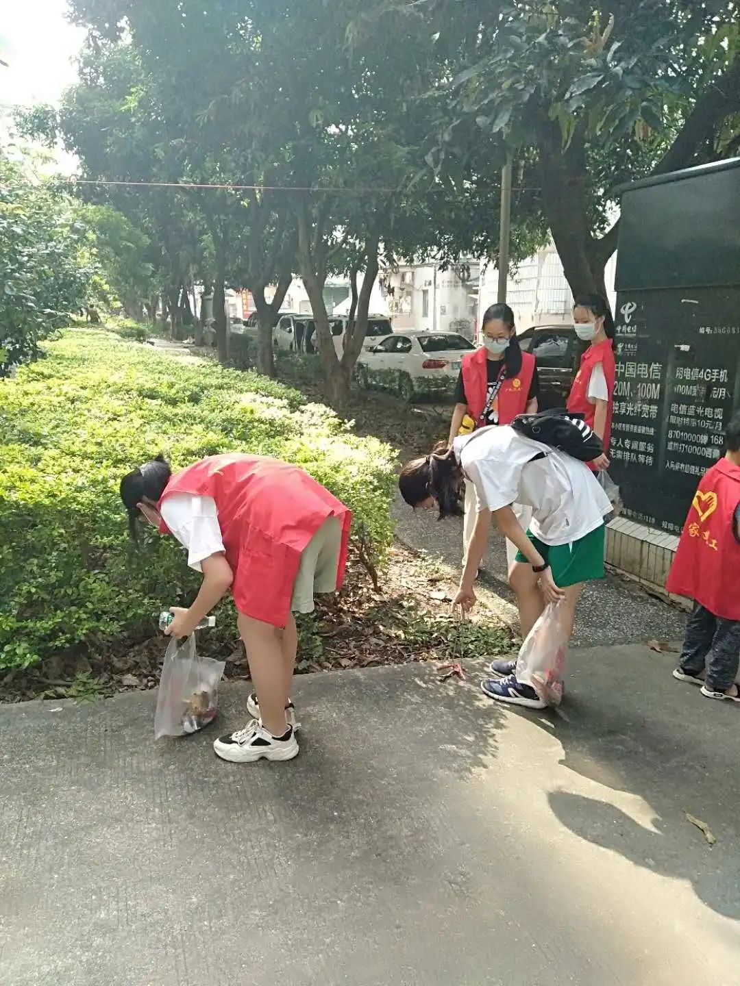 学生志愿者还与社区工作者一起,在社区里清理垃圾、进行垃圾分类处理。
