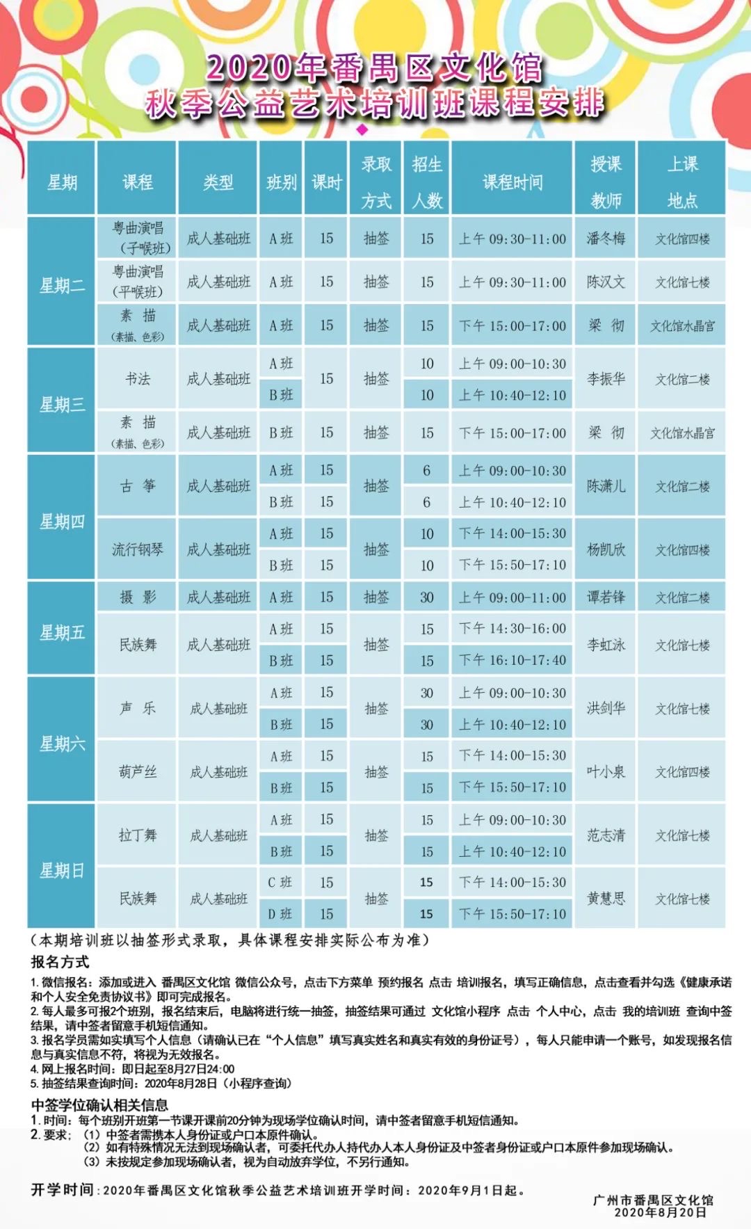 记者8月24日从番禺区文化馆获悉,2020年番禺区文化馆秋季公益艺术培训班将于9月开课,本期培训班共有12个培训项目,共21班次322个学位,提供给广大市民报读。培训为公益免费,各培训项目聘请资深专业教师担任任课教师。