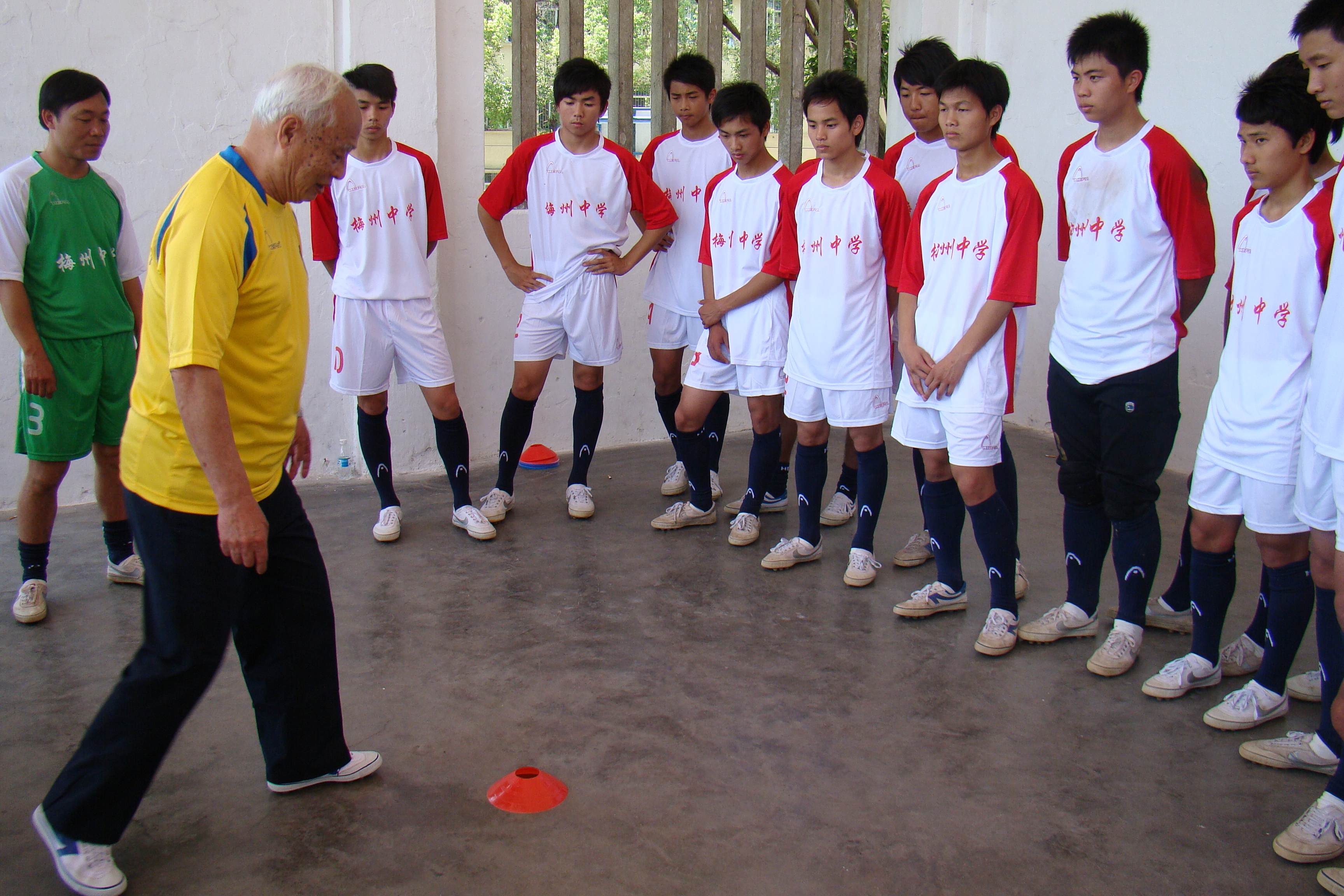 年过八旬的冼迪雄在梅州中学指导校队小球员。(廖艺 摄)