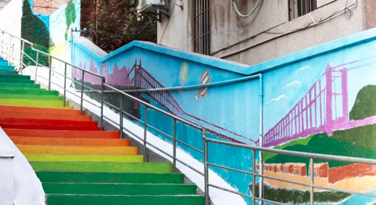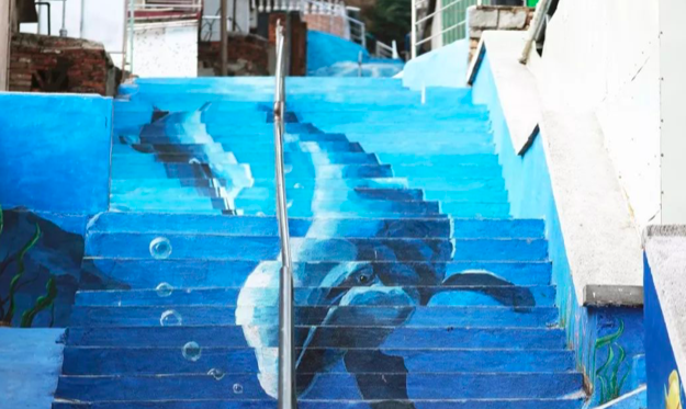 在阳光的照耀下,五颜六色的彩虹阶梯梦幻又可爱。憨态可掬的海豚摆着胖乎乎的身子游上了阶梯,它们想亲吻海底里自由的海草,阵阵风起,落花满地,纯白、淡紫、粉黄色的花瓣,铺满人们回家的路。在这里,每一个转角、每一条小巷都隐藏着意外的惊喜。在这里,鲜花始终盛开,闲散地坐在木质长凳上,看书、发呆,虚度一下午的时光。