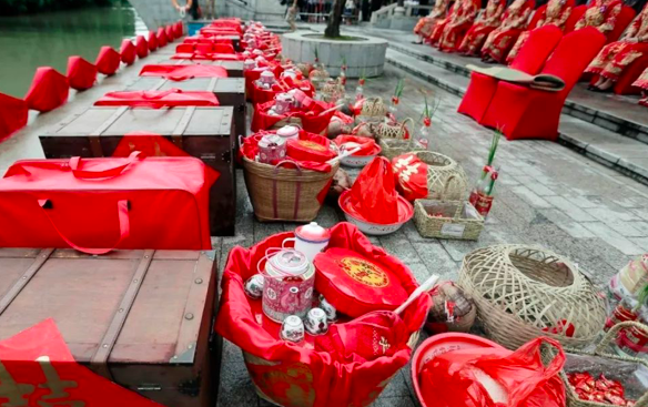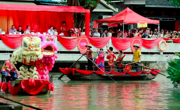 水乡婚礼精心设置了嫁娶路线,新郎从濠涌亲水平台(男家)出发,新娘在党群服务中心前的埠头(娘家)翘首以待,新郎接上新娘后,载上新人的12艘婚艇,浩浩荡荡开始幸福大巡游,先后经过厚德桥、同心桥,最后回到亲水平台,接受亲朋好友和周边居民的祝福。整个水乡婚礼过程中,鸣鞭炮、开席、跨火盆、三拜礼等传统水乡婚礼习俗也一一呈现,婚船上象征着吉祥的一对对“大舅椰”等礼物也重现了疍家人当年结婚的独特“嫁妆”,原汁原味还原水为媒、艇为轿的婚嫁习俗。