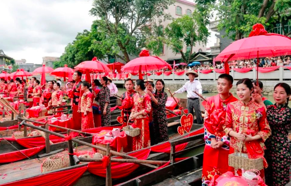 身着龙凤褂、花船喜迎亲,这样别致的水乡婚礼现场你一定没见过!去年,在东涌镇,水乡风情街亲水平台举行的好家风第四届水乡集体婚礼现场,在众人的见证下,来自南沙各行各业的12对新人喜结连理,用沙田水乡传统喜庆的婚俗形式演绎属于自己的浪漫婚礼。