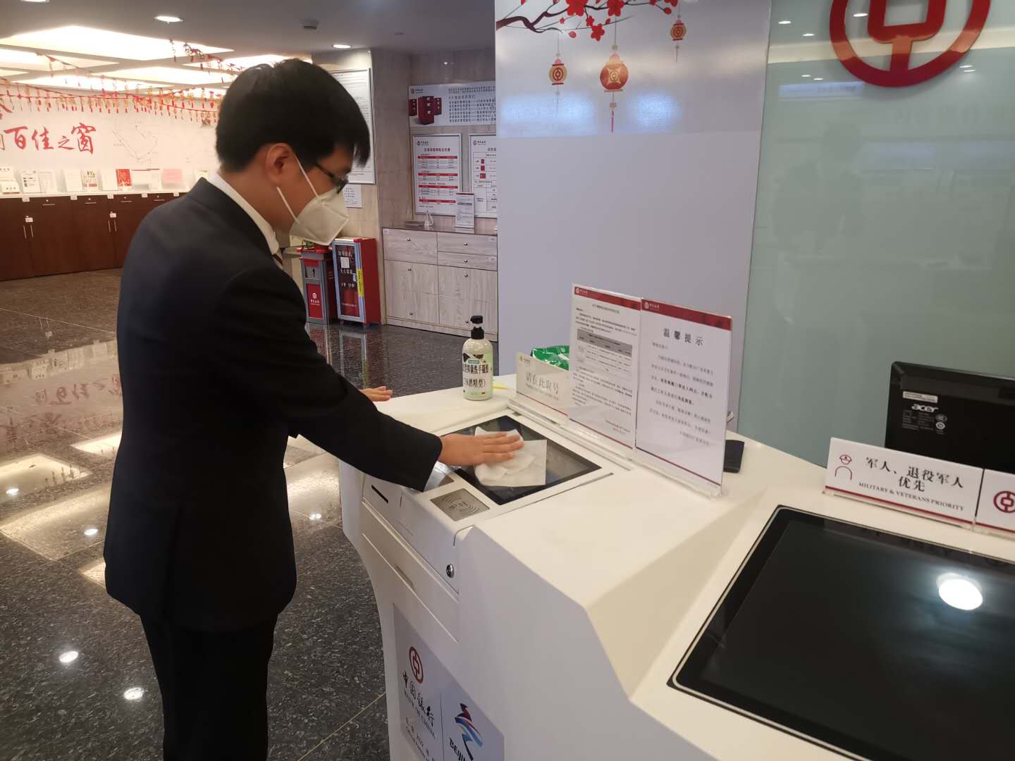 毛滨告诉记者,不仅对客户“严苛”,该营业部每天都要为员工进行体温检测,并要求上班期间佩戴口罩;在营业大厅放置免手洗消毒液、一次性手套、口罩等防疫用品,供客户及员工使用;每两小时对智能柜台、人工柜台、ATM区域进行清洁消毒;每天晚上结束营业还通过紫外线消毒器进行全面消毒。