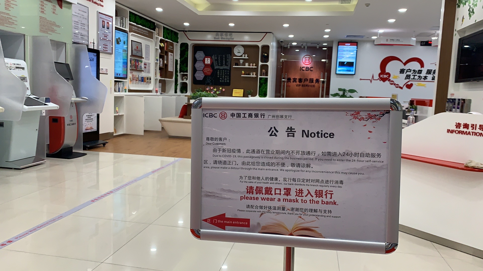 走进海珠区工商银行一网点,记者看到,网点内所有的人都佩戴着口罩,正在排队等待办理业务的客户,也都自觉地隔位而坐。