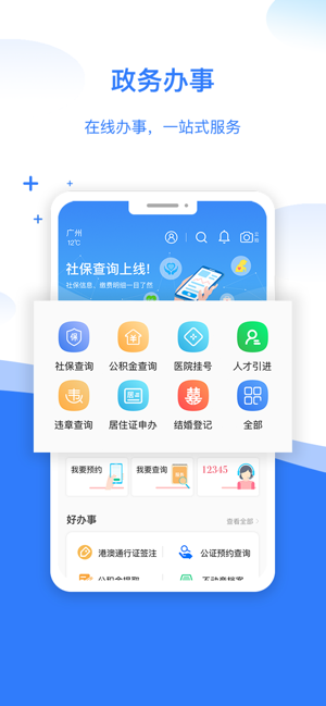 今年年初,全市11个区首批31类服务事项上线移动平台办理,含申领、签注、补换领居住证,《出生医学证明》签发,技能提升补贴申领,一孩及二孩生育登记等高频事项。在此基础上,广州市深入梳理、上线了第二批优化事项清单共24类事项,包括19类服务事项(人社局6类、医保局4类、民政局3类、卫健委2类、市残联4类)和5个证明类办理事项。市民使用“穗好办”APP,通过简单的刷脸实名认证,完成一次注册,即可随时随地办理社保、医保、独生子女年审、民政、残联等高频服务事项。