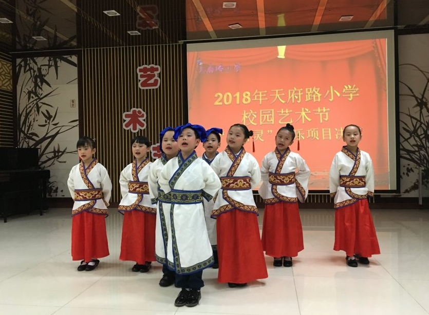 在学校开展的“和美花”艺术课程中,语言艺术社团一直是学校的特色社团。经过数年的发展,天府路小学坚持由特色入常态,夯实学校语艺项目基础。语言艺术社团开设朗诵、主持、话剧、演讲等兴趣小组;每个年级都有经典诵读的固定篇目和自选篇目,语言艺术发展纳入校园文化建设,在每年的学校“艺术节”中,安排语艺项目展演,每年组织好“推普周”活动等。