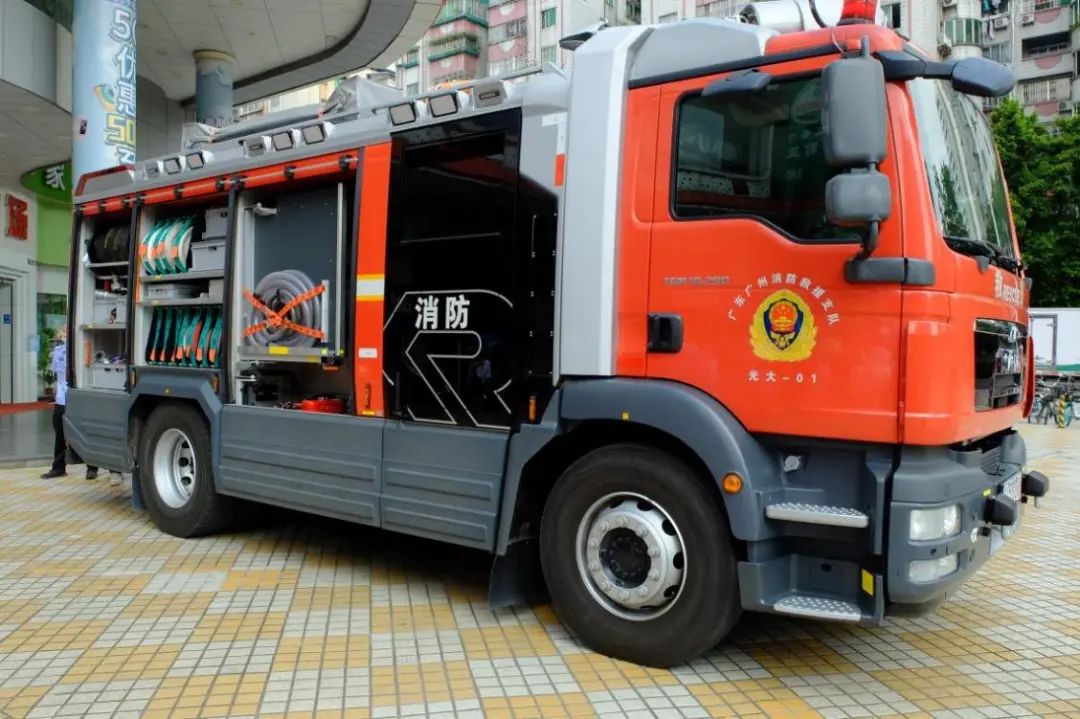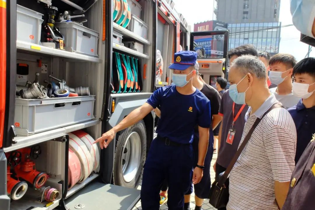 而在另外一辆消防车上,则装备了许多消防器材,由消防员进行一一介绍、讲解。
