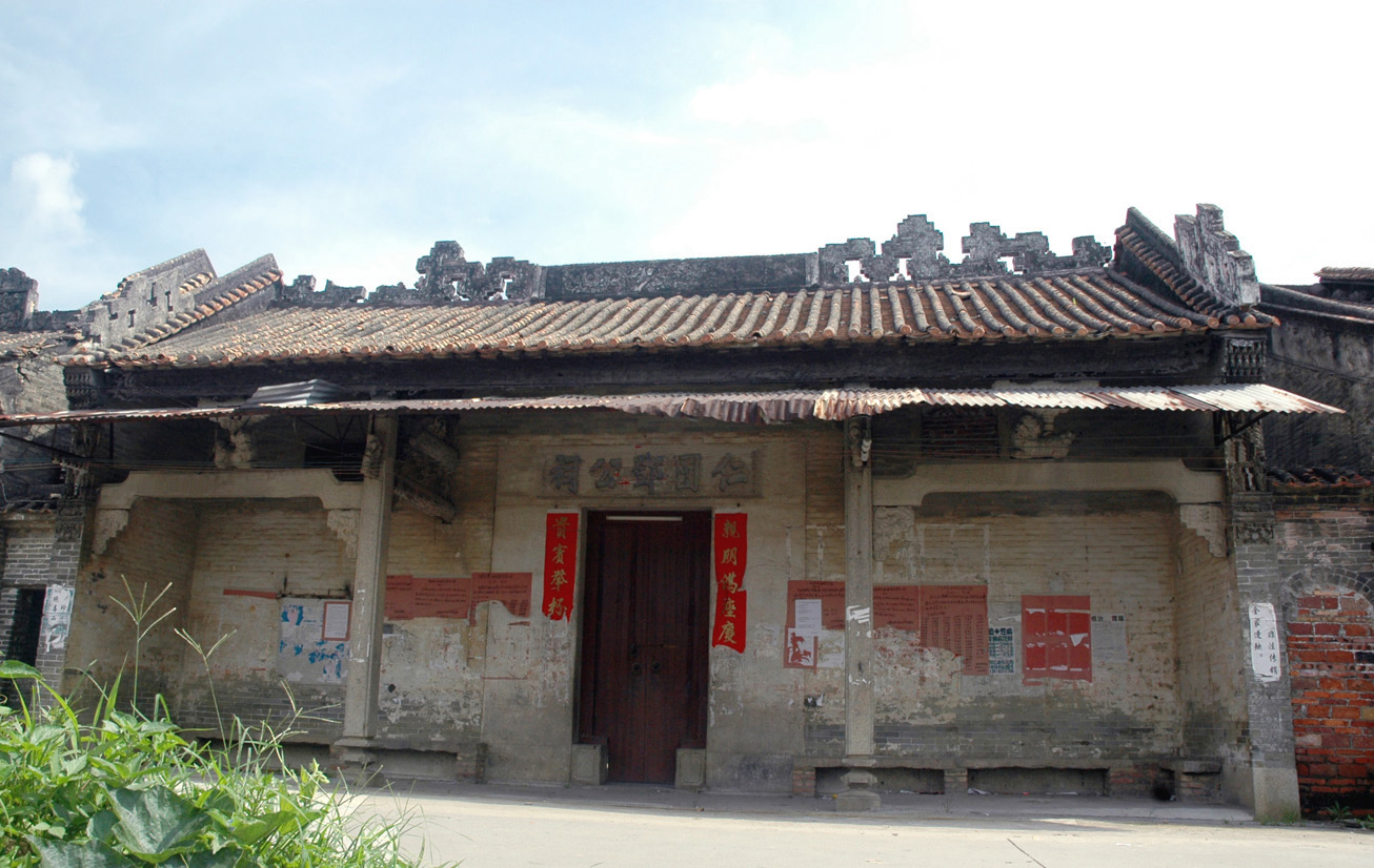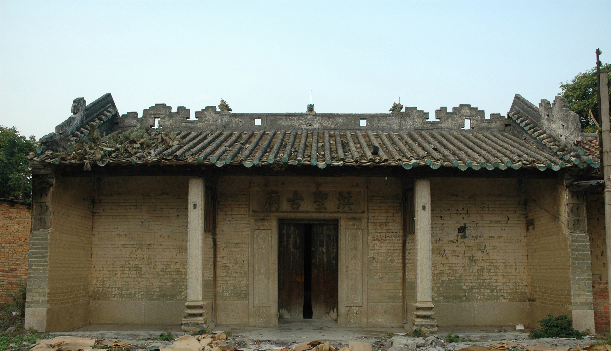 小东圃村建筑整齐排开洪圣古庙位于村口,灰塑博古脊、绿琉璃瓦当、青砖墙等精湛工艺可以感受出这座庙宇当年的气派景象,正脊嵌陶制“二龙戏珠”纹饰,如今仅存二龙的头部。卢福汉解释道,“洪圣”指的是南海神。古庙建成于清咸丰四年(1854),民国三十七年(1948)重修,坐北朝南,三间三进,总面阔9.6米,总进深25.5米。如今洪圣古庙庙门紧锁,透过缝隙可以看到庙内杂草丛生,等待着有关部门进一步开发,挖掘其文化价值。