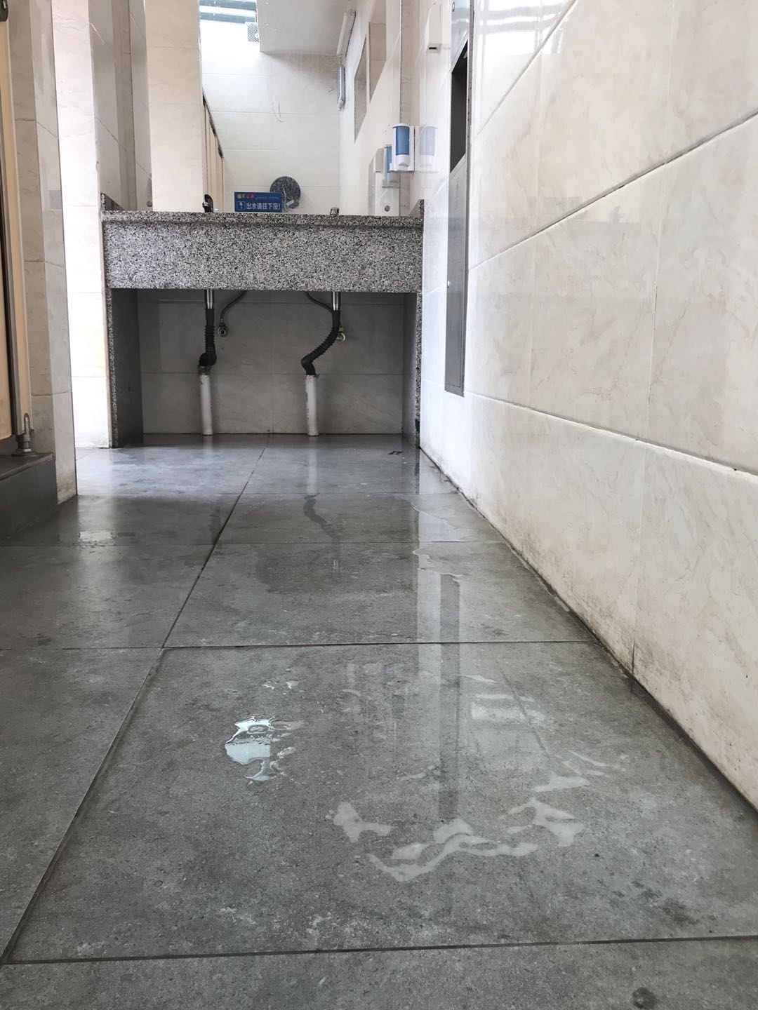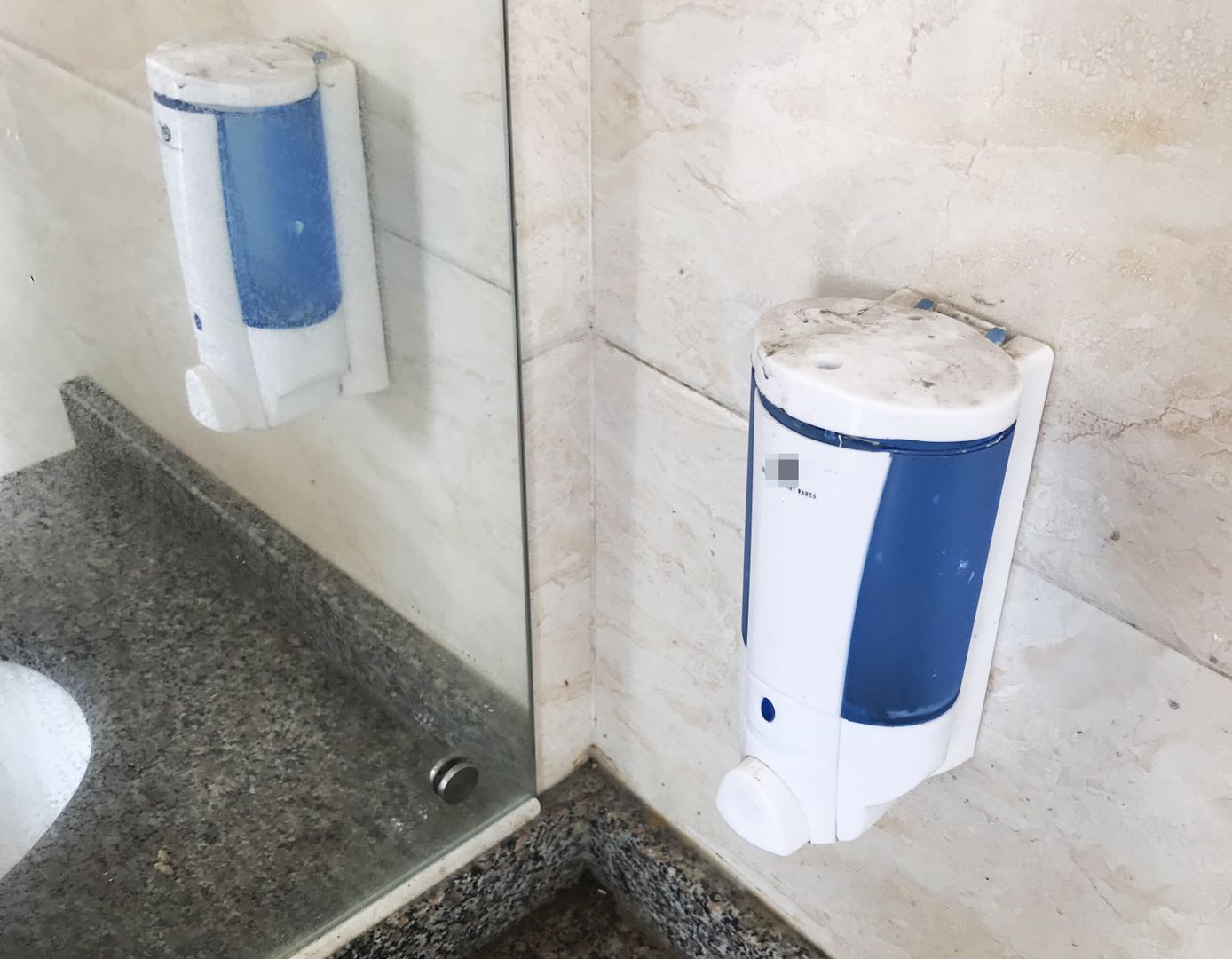 走进马务红棉街的公共厕所的女厕,地面有积水,洗手台靠近墙根的位置有污渍,洗手液盒子空空如也,盒子顶上的污渍明显。坐厕的马桶圈、筒身周围也有斑斑点点的污渍。