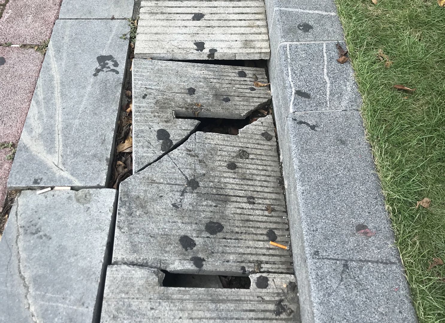 马务联合东街54-1档口旁,路面多块地砖出现破损