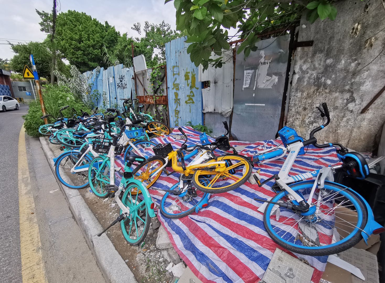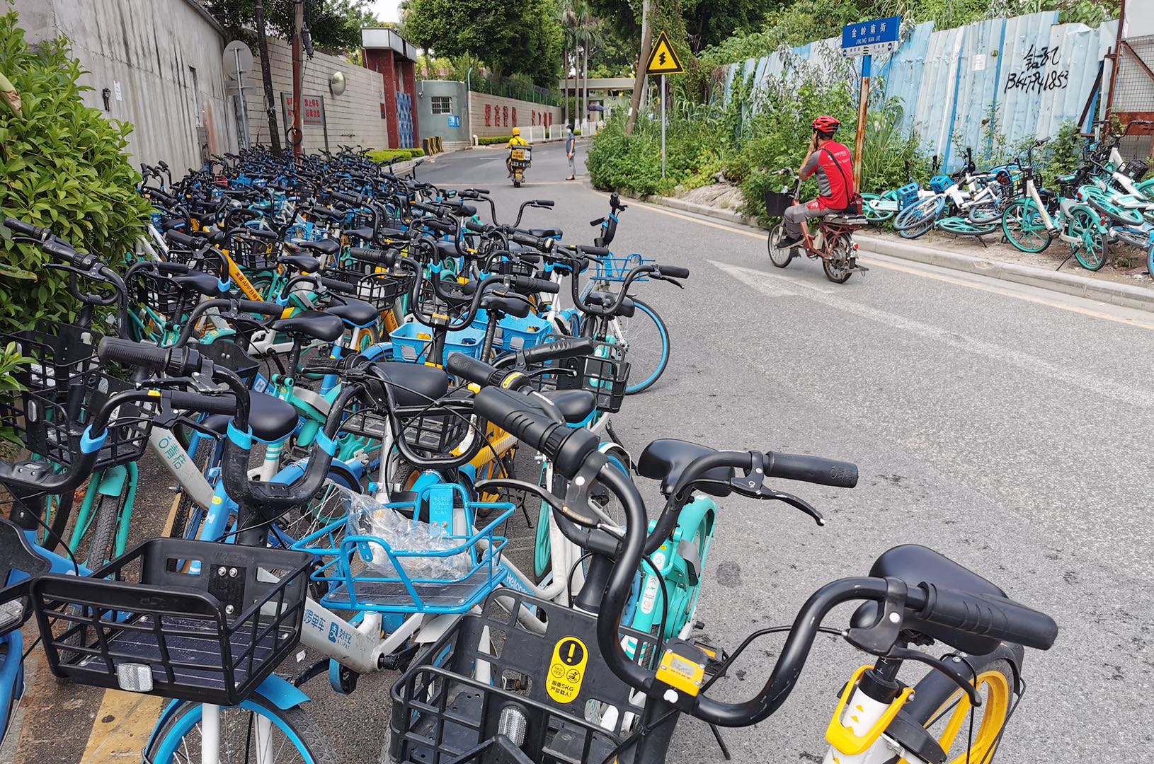 一处是萧岗汇意路和金岭南路交界处,一两百辆共享单车密密麻麻地沿着围墙一路停过去,最密集出,对开两车道的金岭南路被侵占了三分之一,机动车行驶至此,不得不刹车逆向借道,影响对向车辆通行。而在马路的另一边,几十辆共享挡车被横七竖八地扔在地上堆了起来。