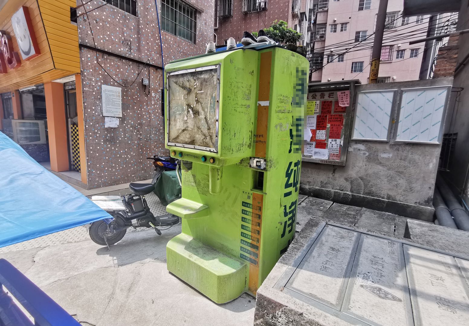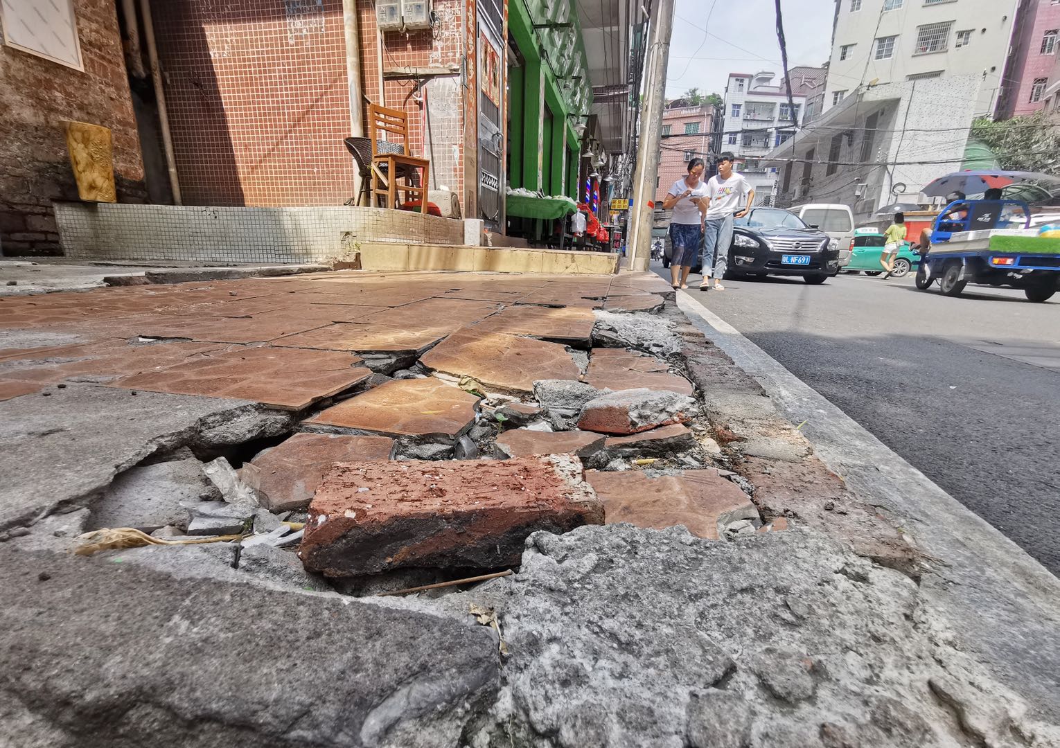 在马务联合东街49号对面,有一部印有“XX纯净水”字样的设备,柜体邋遢,已无法使用,柜顶铺着一张石棉瓦,变成了街坊晾晒布鞋的“好地方”,压着石棉瓦的砖头满是青苔。有街坊表示,这部净水器废弃了有段时间了,也没人来处理。马务联合东街54-1档口旁,路面多块地砖出现破损。