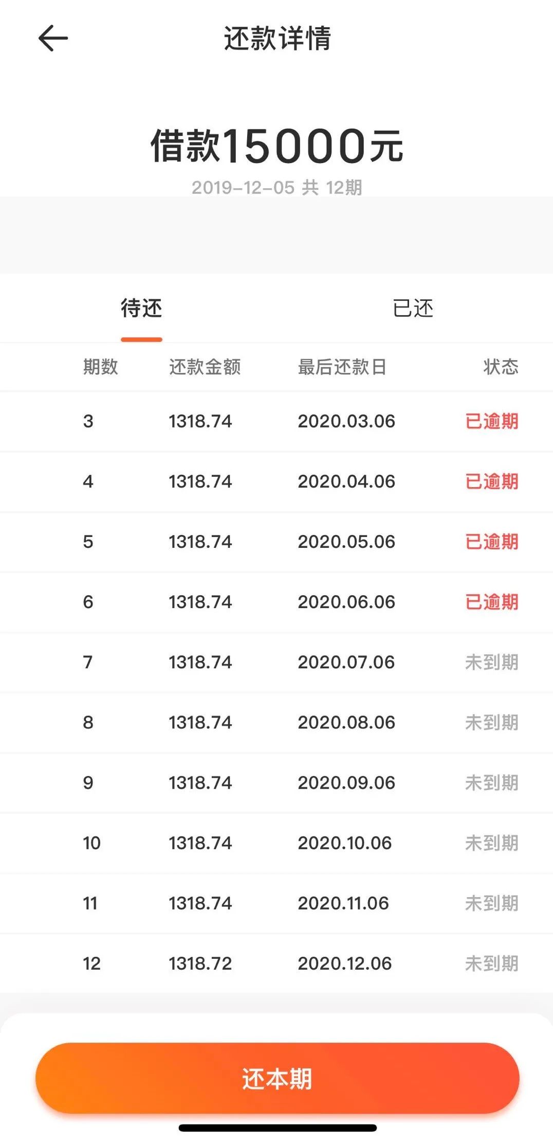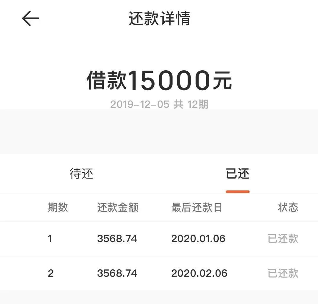 高飞龙告诉记者,“贷款15000元放款后,在至今没有机会看合同的情况下,我发现第一期和第二期的还款金额均是3568.74元。这相当于头两个月就要还7137.48元。并且接下来10个月,利息仍然按照15000元计算,每期分别归还1318.74元。”