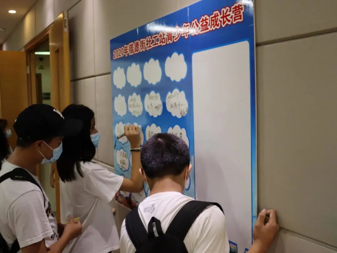 参与青少年陆续来到社工站,统一穿上营服、戴上帽子在签名板上醒目地签上自己的姓名,并写上对本次夏令营的期望:“开心”“交朋友”“玩得happy”“更快更高更好”。在开营环节上,社工介绍本次公益成长营的目的、意义和流程,组织青少年在趣味游戏中相互认识,打破陌生感。