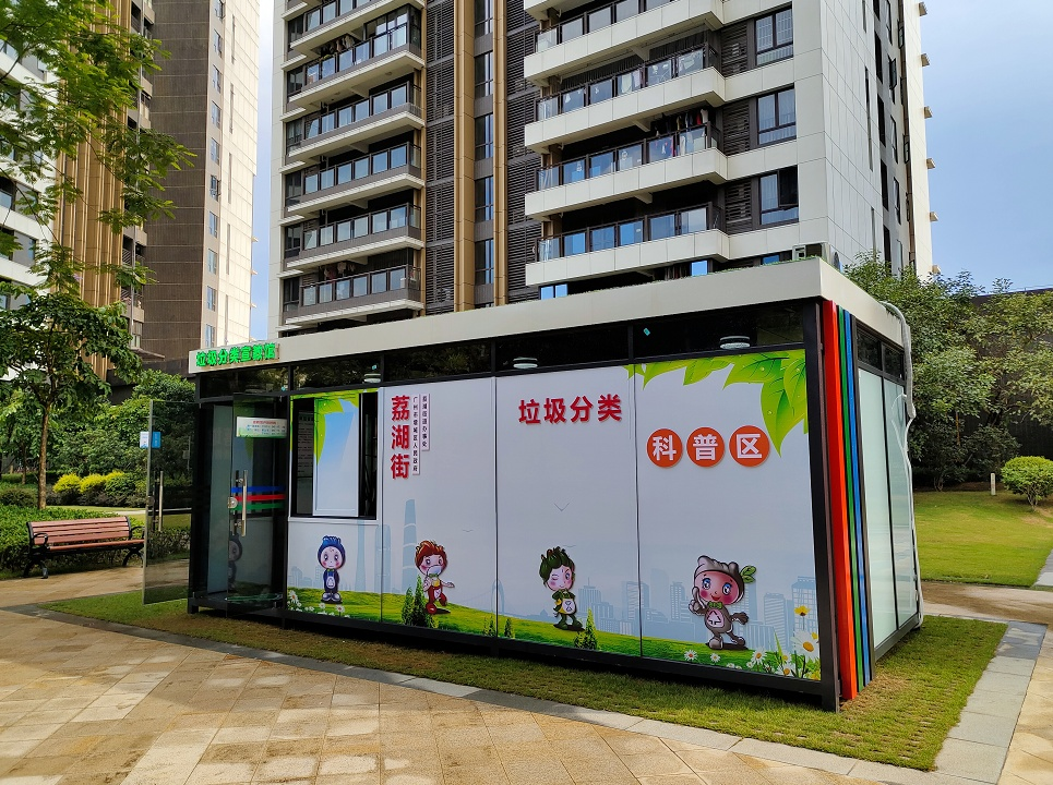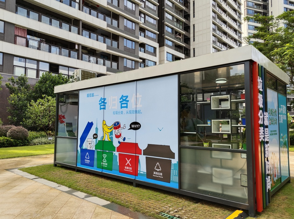 宣教馆占地面积20平方米,从外观上可以清晰看到关于垃圾分类的宣传标语以及标识。