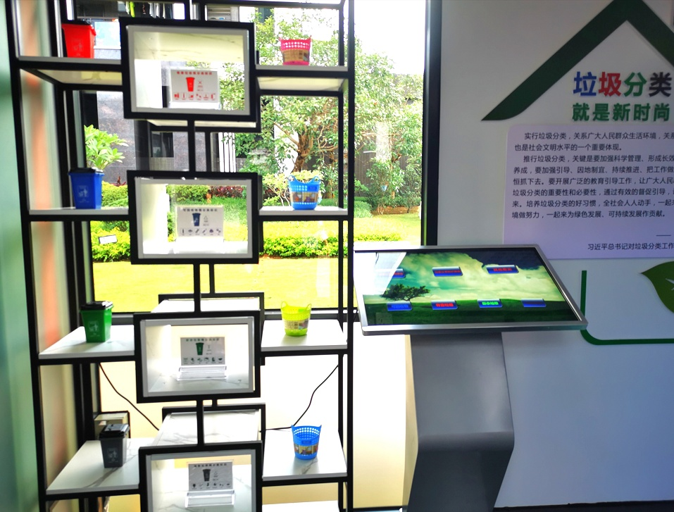 内设液晶显示屏循环播放垃圾分类宣教视频、垃圾分类宣传墙和垃圾分类宣传品展示柜,以及垃圾分类“跳一跳”小游戏区域。