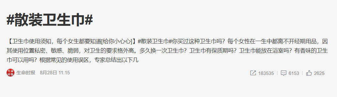 目前,“散装卫生巾”已经在微博上形成热搜话题。截至广州日报记者发稿前,该热话题已经有超过18万转发,超6000条留言。