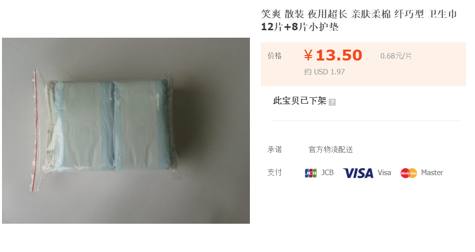 而在另一家宣称“采用美国胶机生产”、同样热卖散装卫生巾、卫生护垫等商品的网店,记者看到20片“卫生巾+护垫”组合销售的散装产品标价13.5元。而这家网店在记者发送咨询信息后不久,就显示“此宝贝已下架”。