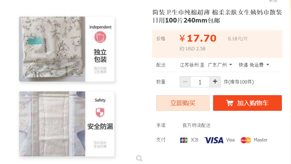 记者在一家销售散装卫生巾的网店看到,一包100片的散装卫生巾售价17.7元包邮,均价一片只要一毛八。记者尝试联系商家咨询有关资质和质检证明,但截至发稿前面,对方一直未回复。