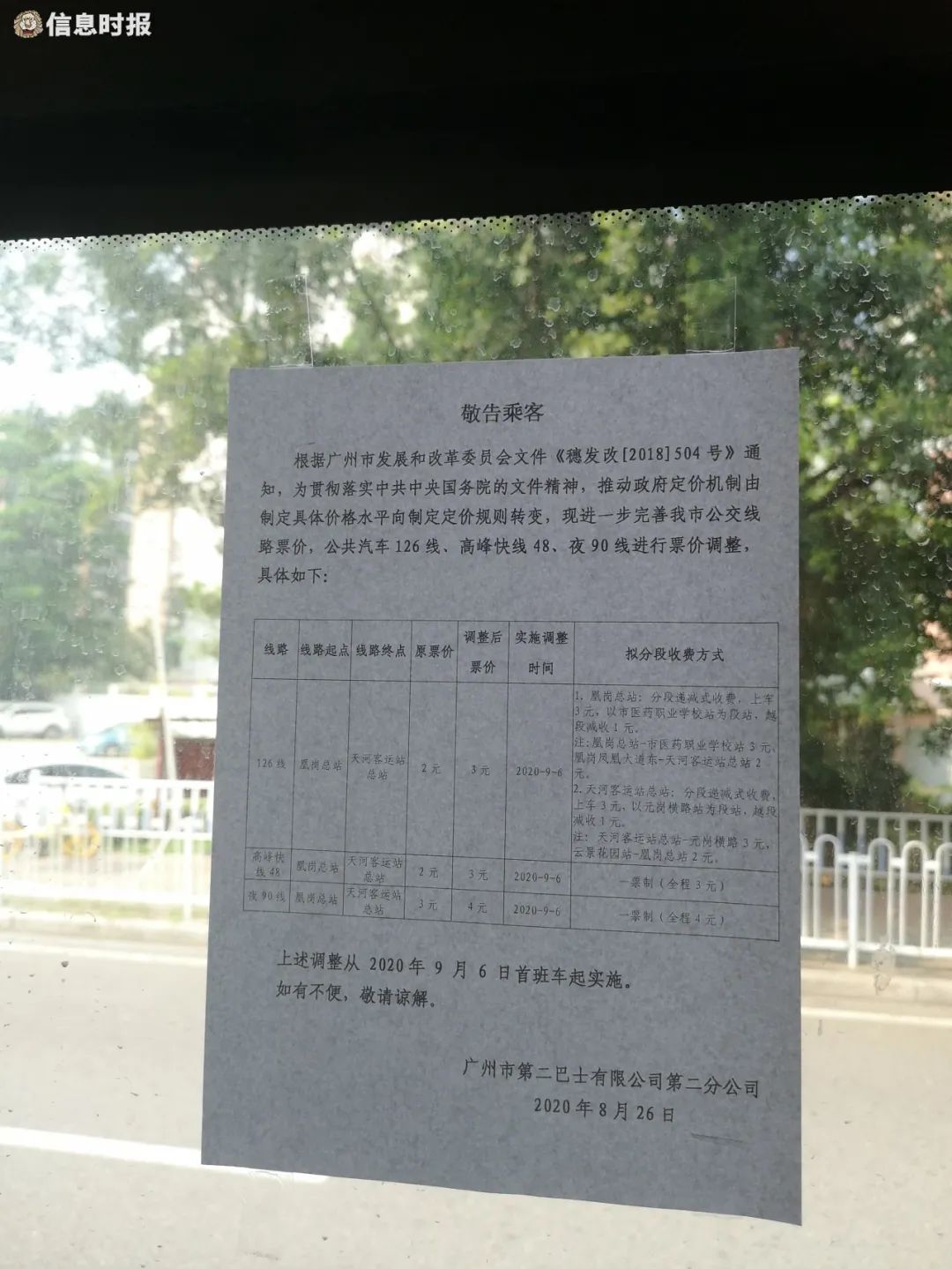 同日,记者还了解到,3条起止点均为凰岗总站—天河客运站的公交线路拟将从9月6日起调价,总价均提升1元,126线拟分段收费。