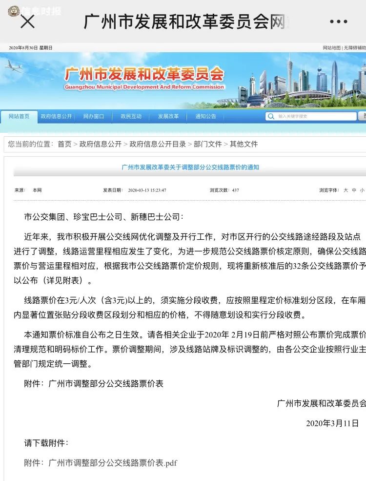 关于上述线路调价的情况,记者目前暂未在广州市发改委看到相关调价公示。不过,记者了解到,广州市第二巴士有限公司第二分公司近日曾公示过一份票价调整通知。