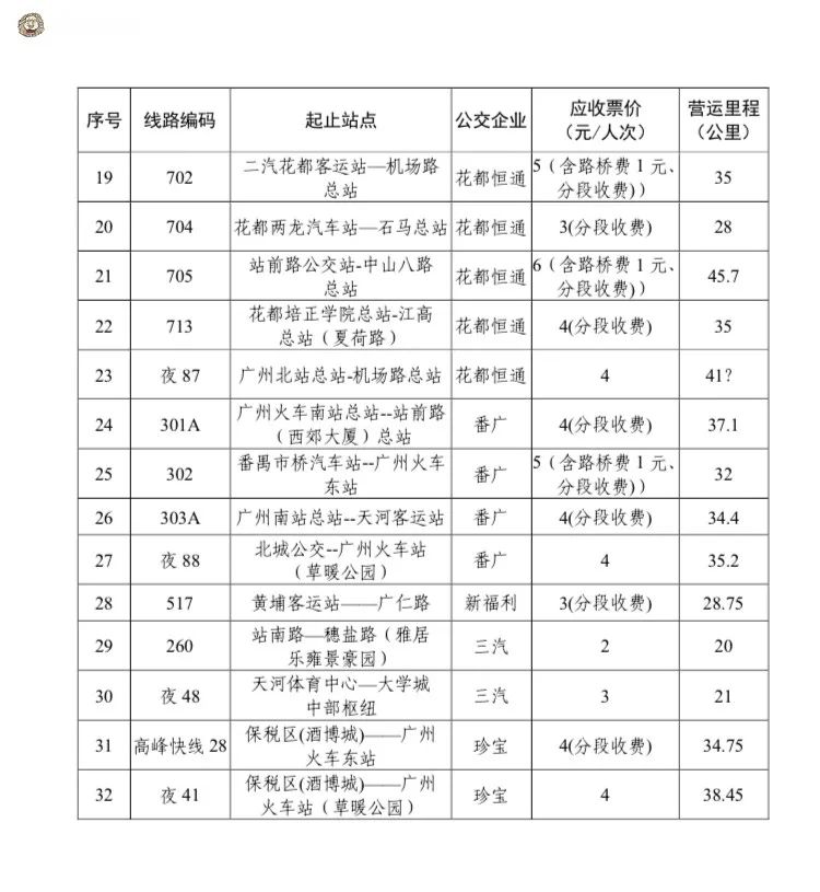 广州发改委今年3月公布的32条公交线路票价调整通知