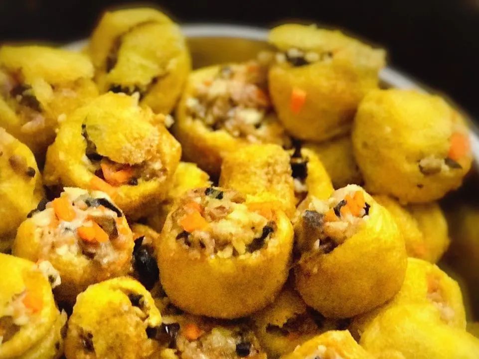 酿油豆腐前,要先用清水浸泡糯米四五个小时,并着手准备馅料。虽然各家有各家的味道,但主料都离不开糯米和半肥瘦的肉,根据个人喜好,再添加马蹄、香菇、香葱、腊肉等,把佐料剁碎,加盐加油,与糯米一起拌均匀。然后,将油豆腐小心地撕开一个小口子,把拌均的馅料塞入油豆腐内,塞得圆鼓鼓胖墩墩。最后,将酿好的圆鼓鼓的油豆腐放入锅里,加水煮。