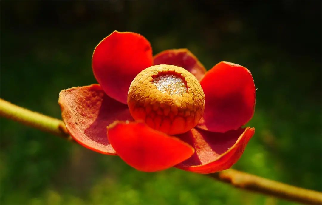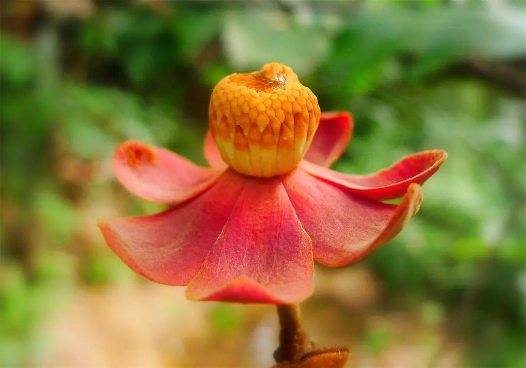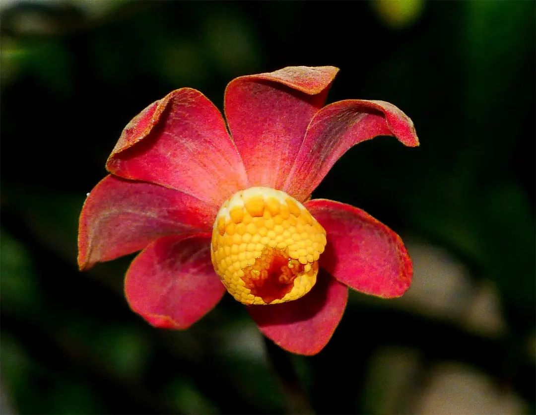 我觉得后一种命名的说法,怎么也不如前面那种开花时看到的更形象生动——紫红色花瓣,像玉盘般张开;玉盘上那数也数不清的雄蕊雌蕊,大大小小,黄灿灿的,还流出有蜜汁,真是活脱脱的一幅“大珠小珠落玉盘”的美画!
