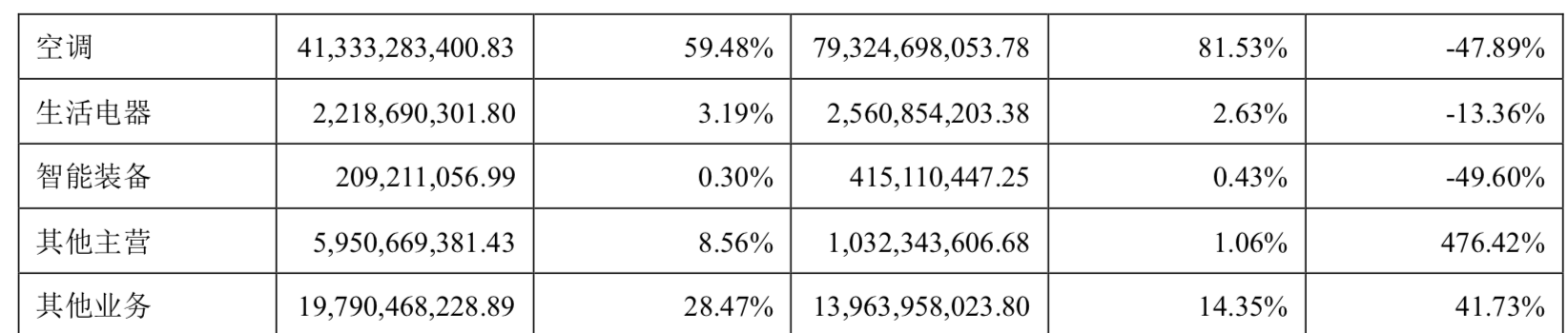 记者留意到,在具体业务方面,今年上半年空调的营收为413.33亿元同比下滑47.89%;生活电器营收22.19亿元,同比下滑13.36%;智能装备营收2.09亿元,同比下降49.60%;其他主营营收59.51亿元,同比增长476.42%。