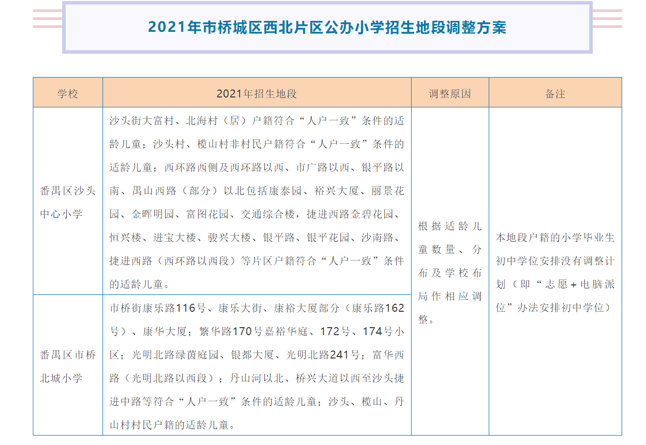 番禺区教育局介绍称,根据市、区现行义务教育学校招生文件精神,区教育局充分考虑市桥城区西北片区地理状况、交通状况、人口分布、学校规模、学校布局及历史遗留问题等因素,经广泛听取市民意见、建议,进行审慎论证,形成《2021年市桥城区西北片区公办小学招生地段调整方案》(下简称“方案”),并上报番禺区政府审定、向市教育局报告,报广州市招生考试委员会。