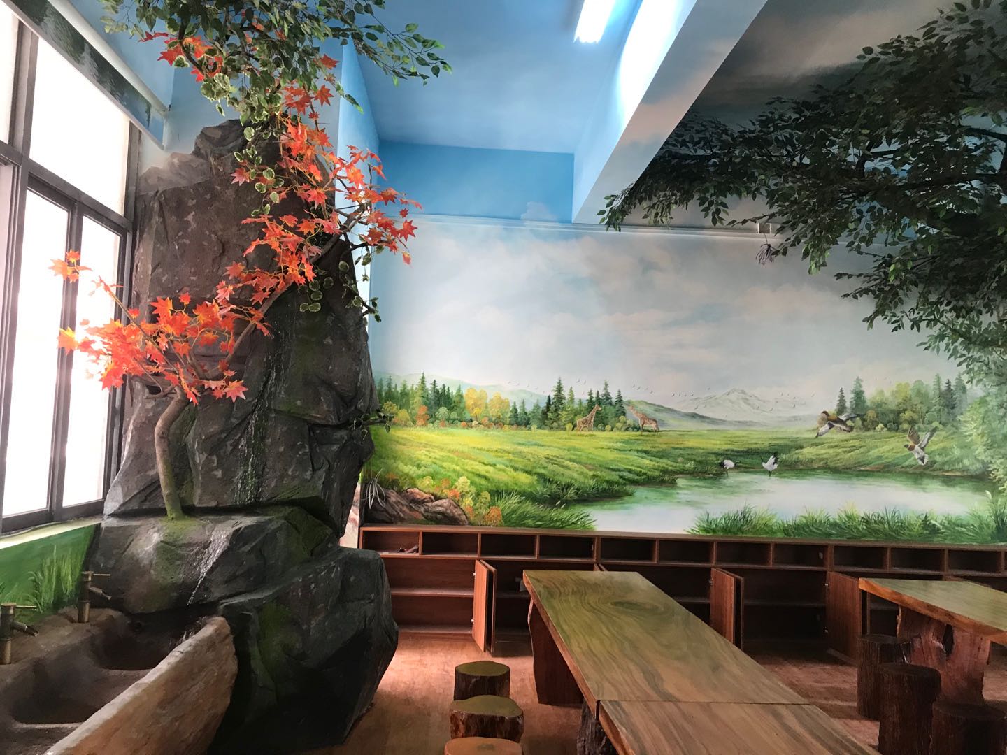 学校还特别设置森林作画室,安排原木的桌子、凳子,装饰有人造的假山、树木,再加上满墙的自然山水画,让整个作画室充满自然气息,“虽由人作,宛自天开”。新雅小学校长吉庆燕说,这里特别受孩子们的喜欢。