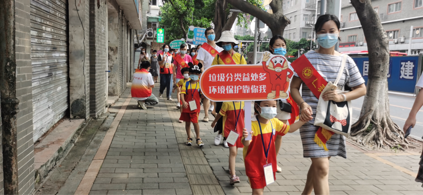原来,这是在彩虹街党工委、街道办事处指导下,彩虹街社工服务站联合彩虹街城管科、彩虹街关工委、中兴社区居委、冼家庄社区居委、荔景社区居委、荔溪社区居委、彩虹幼儿园、广州东浚开发有限公司开展的“小能量大作为”彩虹街垃圾分类巡游活动。
