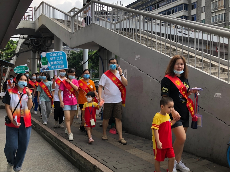 不久前, 由街道内的街坊们组成的垃圾分类巡游队伍从彩虹街社工服务站出发。有的志愿者举着垃圾分类标语牌、有的向沿途居民派发宣传单,时不时还传来垃圾分类的口号,浩浩荡荡。