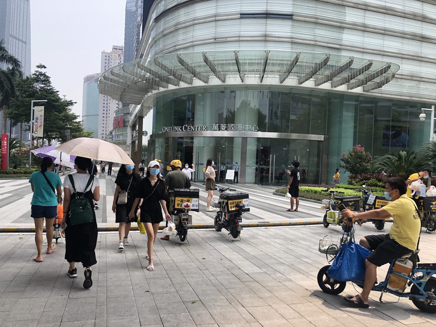 (外卖小哥和白领都佩戴口罩。)