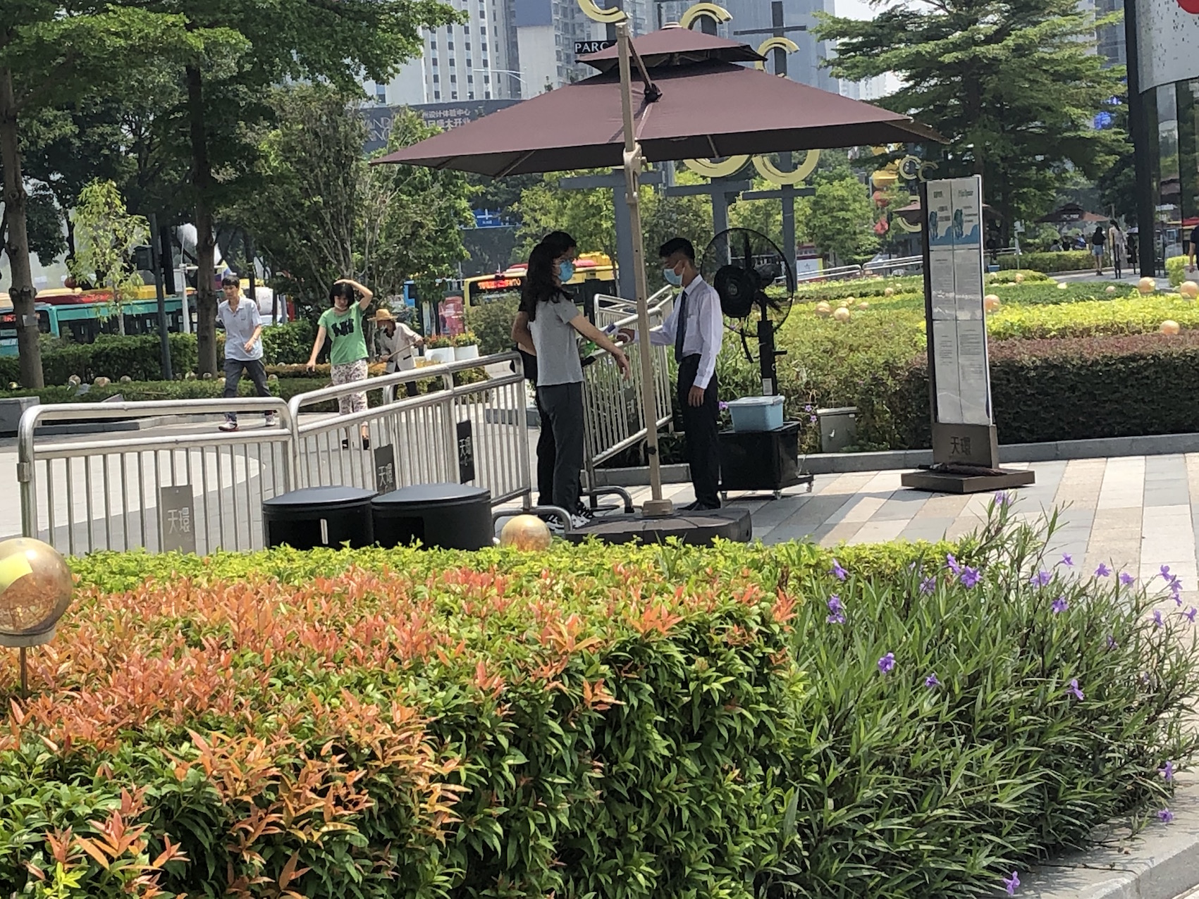 从天河城百货往前走,全媒体记者来到天环广场,天环广场不少测温点设立在户外,中午天气炎热,记者观察到,测温点均有专人手持测温仪为进入商场范围的市民测温,进入的市民也都非常配合,均佩戴好口罩。