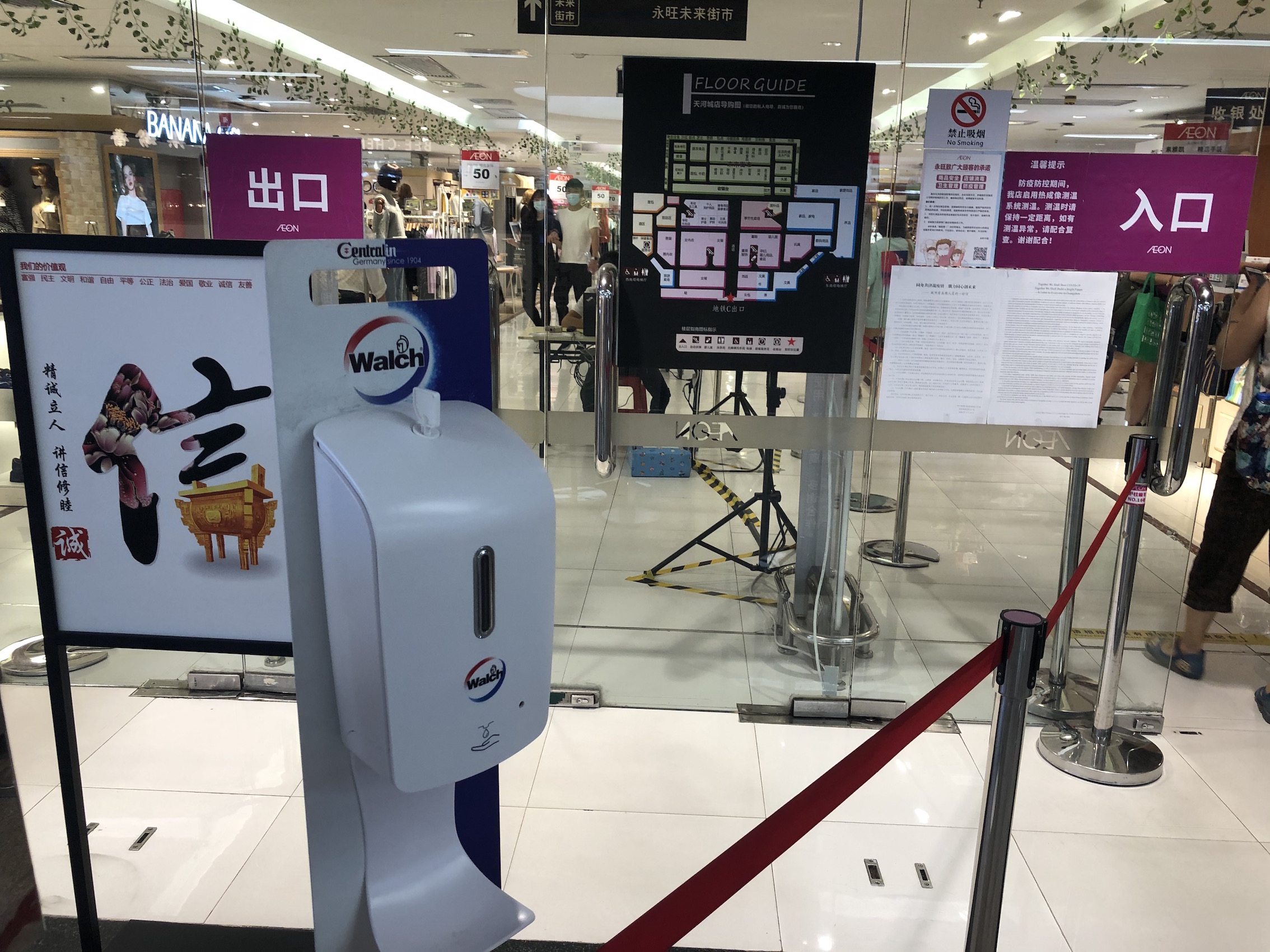 (商场门口有洗手液等消毒用品供市民使用。)