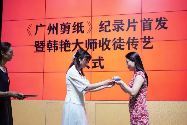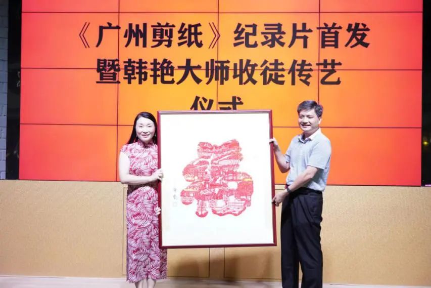 仪式上,广州市海珠区少年宫教师、广州剪纸第三代传人韩艳自费筹划、拍摄、制作的《广州剪纸》纪录片首发,该纪录片详细介绍了广州剪纸的历史沿革、表现形式、制作方法、主要特征和重要价值,展示了大量美丽的剪纸作品和当代五代传承人的风采。