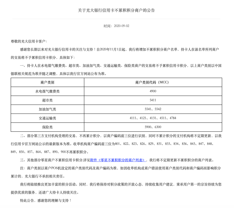 光大银行信用卡中心发布《关于光大银行信用卡不累积积分商户的公告》,自2020年11月1日起,光大银行将增加不累积积分商户名单,包括在水电煤气缴费类、超市类、加油加气类、交通运输类、保险类商户的交易,以及部分第三方支付机构受理的交易。