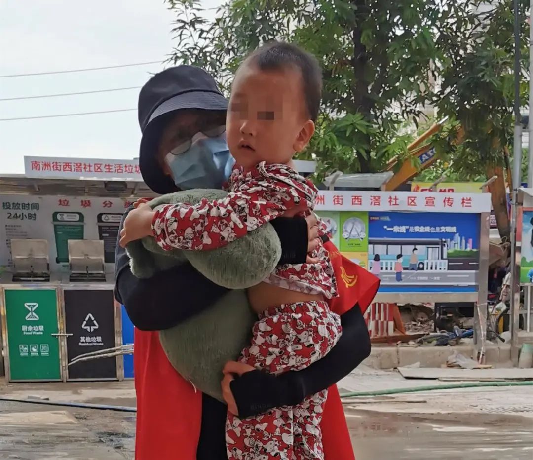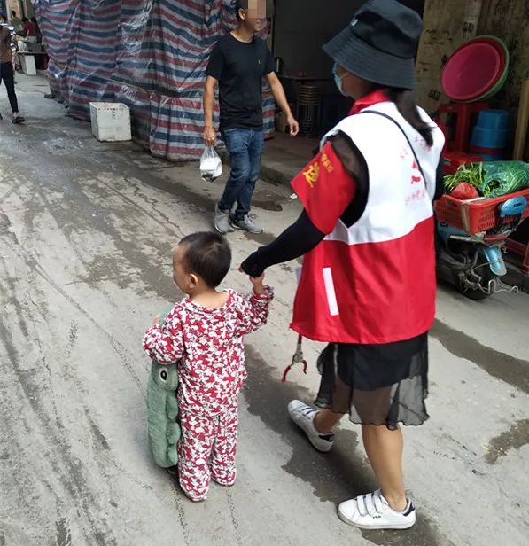 西滘社区党支部的冯佩莹告诉记者,“我们一大早就开始到内街巷清理乱张贴,清理到头洲围大街的时候,发现有个小孩就穿着一身睡衣,抱着一个毛绒公仔,光着脚丫、漫无目的地走来走去。”