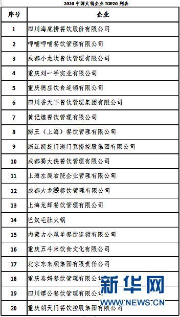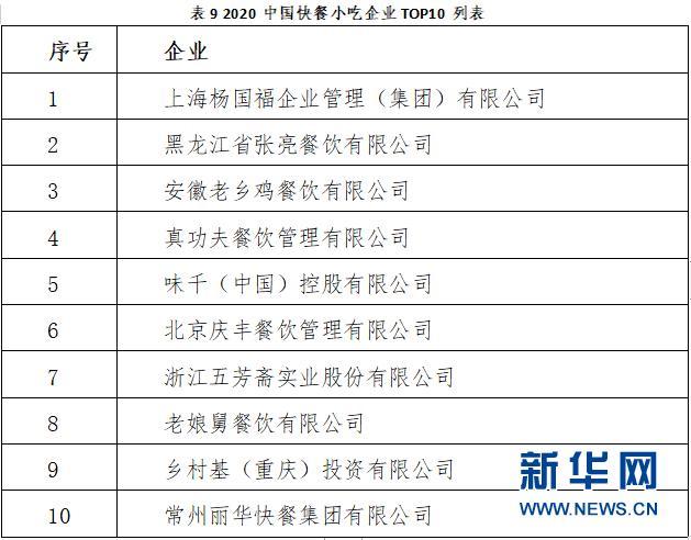 在这次《2020中国餐饮业年度报告》中,正餐前10名企业分别为:杭州饮食服务集团有限公司、山东凯瑞商业集团、北京华天饮食集团公司、广州酒家集团股份有限公司、上海杏花楼(集团)股份有限公司、重庆陶然居饮食文化(集团)股份有限公司、蓝海酒店集团、内蒙古西贝餐饮集团有限公司、九毛九国际控股有限公司、南京大惠企业发展有限公司。
