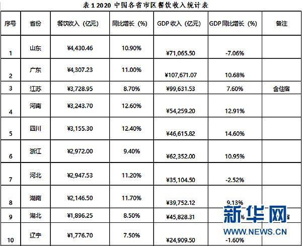 在2020中国各省市区餐饮收入排行(2019财年)中,山东省以4430.46亿元蝉联第一名,同比增长10.90%,广东、 江苏(含住宿)、河南、四川、浙江、河北分列第二至七位,餐饮收入分别为4307.23亿元、3728.95亿元、3243.70亿元、3155.30亿元、2972亿元、2947.53亿元,分别同比增长11.00%、 8.70% 、12.60%、 12.40% 、9.40% 、11.20%。