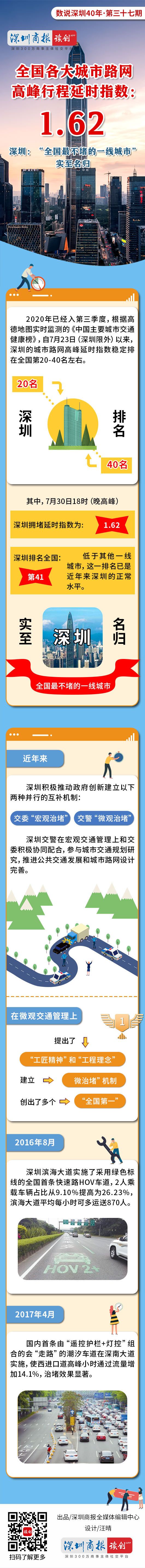 2020年已经入第三季度,根据高德地图实时监测的《中国主要城市交通健康榜》,自7月23日(深圳限外)以来,深圳的城市路网高峰延时指数稳定排在全国第20-40名左右。其中,7月30日18时(晚高峰),深圳拥堵延时指数为1.62,排名全国第41,低于其他一线城市,这一排名已是近年来深圳的正常水平。“全国最不堵的一线城市”可谓实至名归。