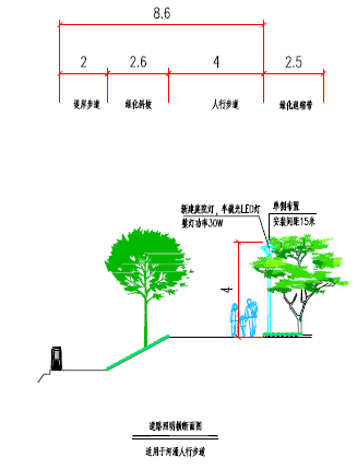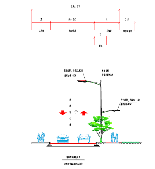 车行道宽度小于10米的城市支路(双向两车道及以下规模),在车行道单侧布置双挑臂LED路灯,安装间距30米;灯具整灯功率为:100W/40W,灯具安装高度为10m/5m,设计照度为14lx,功率密度为0.33W/㎡。