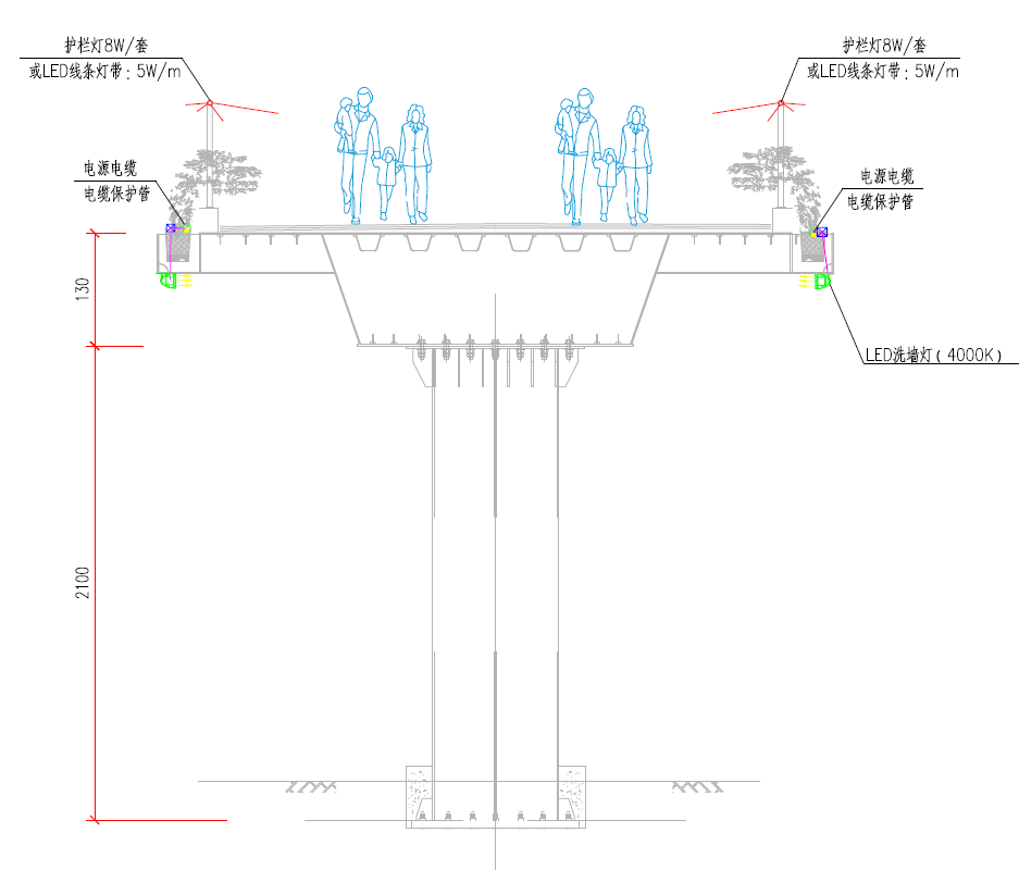 人行天桥可以天桥护栏作为灯具载体,安装LED护栏灯或LED线条灯来提高人行天桥照度,桥底在柱子或外侧桥面上安装投光灯补充桥底黑区照明。
