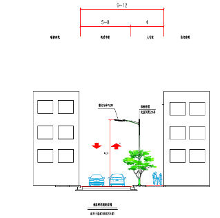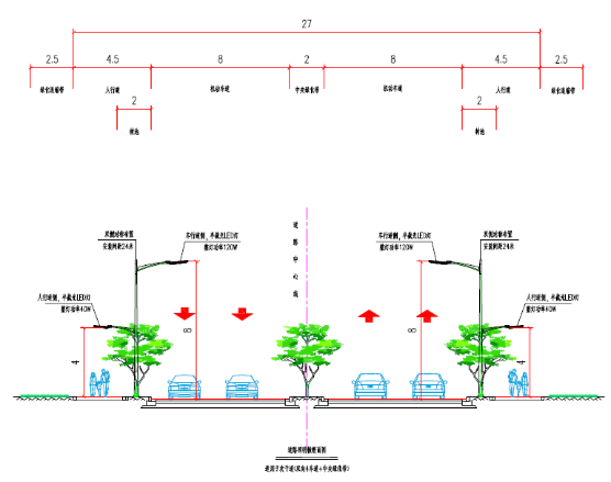 单向车行道宽度为5-10米的城市次干道(双向四车道),计划在车行道两侧对称布置双挑臂LED路灯,安装间距24米;灯具整灯功率为:120W/40W,灯具安装高度为8m/4m,设计照度为26lx,功率密度为0.63W/㎡。