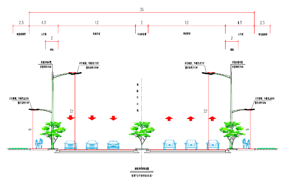 其中,单向车行道宽度为12米及以上的城市主干道(双向六车道及以上道路),将在车行道两侧对称布置双挑臂LED路灯,安装间距36米;灯具整灯功率为:250W/60W,灯具安装高度为12m/6m,设计照度为34lx,功率密度为0.58W/㎡。