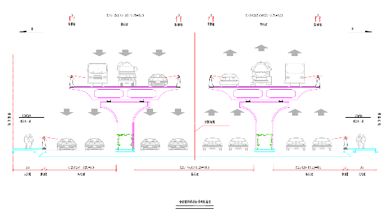 高架桥下无照明的路段,在最外侧车道依靠桥底柱子上安装的挑臂灯提供照明,桥墩间隔较远且挑臂长度有限,且车行道+人行道的宽度较大,两侧人行道和靠近人行道的车行道的照度不满足规范要求。考虑现状人行道条件复杂且贴近两侧商铺,不适合设置双挑臂路灯,利用现状车行道和人行道间的分隔护栏安装护栏灯进行低位照明来补充现状人行道+车行道的照明。