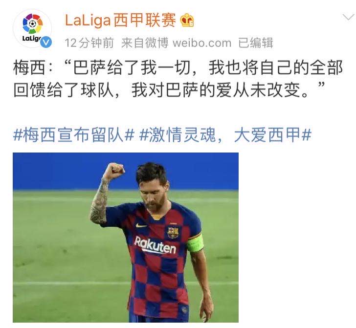 最后,梅西强调:“我们有了新的教练和新的思路,这是很好的,但是我们必须要看看球队的化学反应,能否让我们保持最高的水平。我能保证的是,我会留下,我会为巴萨尽我最大的努力,尽着我的最大努力带领球队去争夺锦标,希望我可以用最好的表现可以鼓舞一些正在度过艰难时刻的人们,将胜利献给所有正在遭受苦难的家庭,我相信我们最终可以战胜病毒,让生活回归常态。”